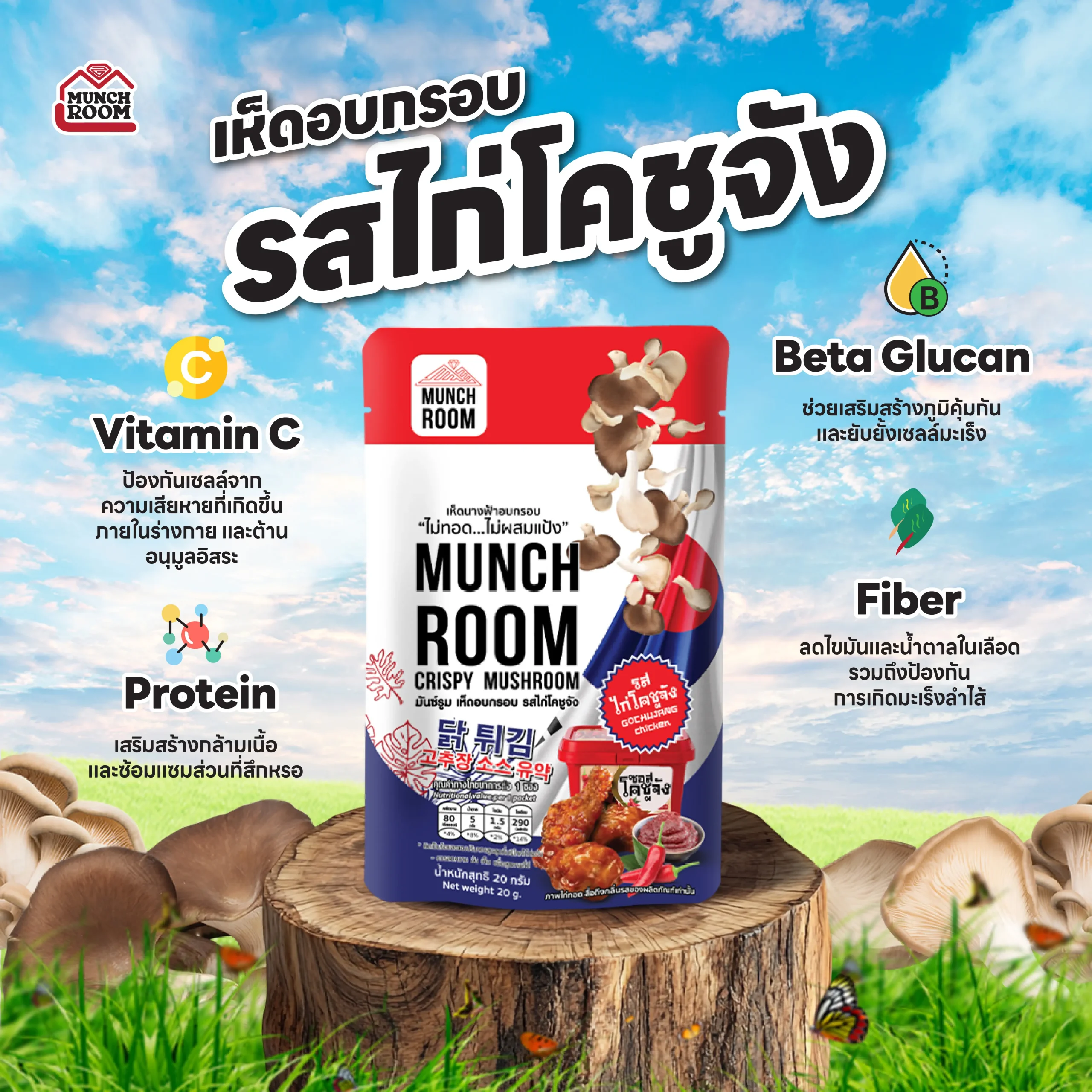ผลิตจากเนื้อเห็ดนางฟ้า ปลูกโดยปราศจากสารเคมี นำมาฉีกด้วยมือเพื่อรักษาคุณค่าของเห็ด ปรุงรสจากวัตถุดิบชั้นเลิศ ผ่านการอบอย่างพิถีพิถัน จนได้อาหารว่างแสนอร่อย มากประโยชน์ ดีต่อสุขภาพ สามารถรับประทานได้ทันที หรือนำมาปรุงอาหารได้หลากหลายเมนู พกพาสะดวก เก็บได้นาน